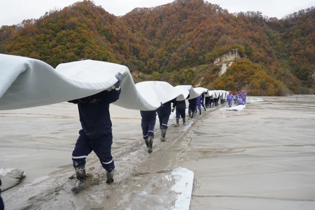 他们奔忙在尾矿库坝面上,铺设防渗席垫;