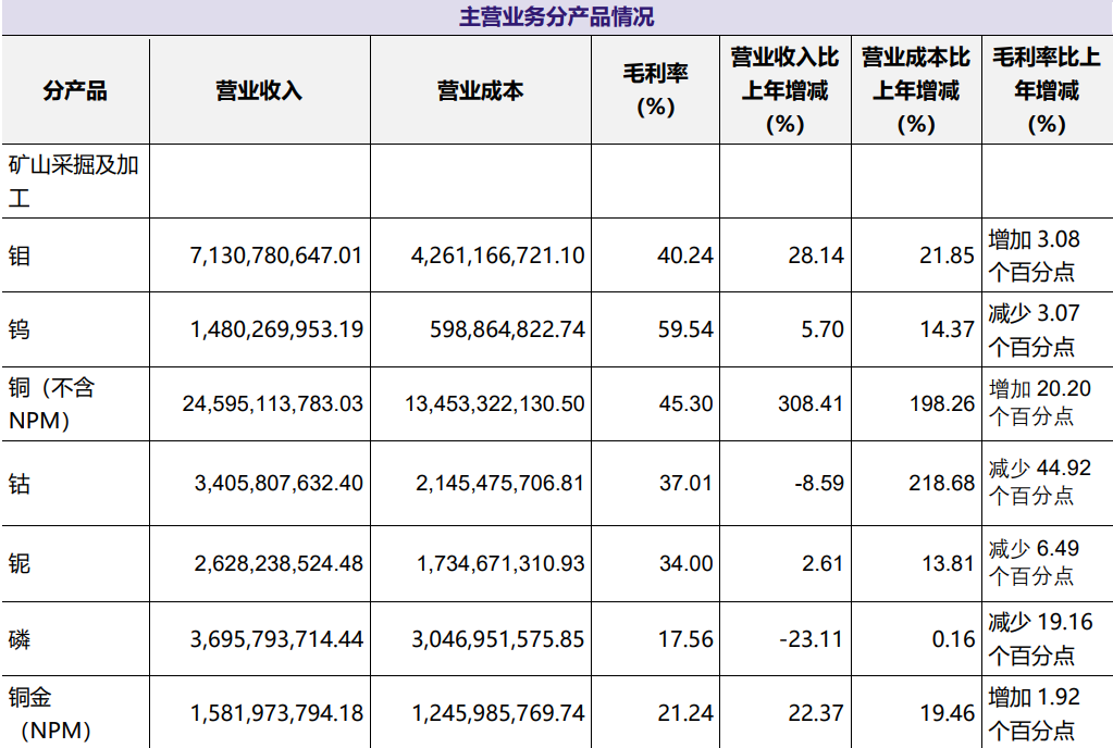 2023年,该公司铜、钴、钼、钨等产品产量同比增长,多项经营数据创出2012年上市以来的历史新高。当期公司营业收入达到1863亿元,同比增长8%,实现净利润82.5亿元,同比增长36%。